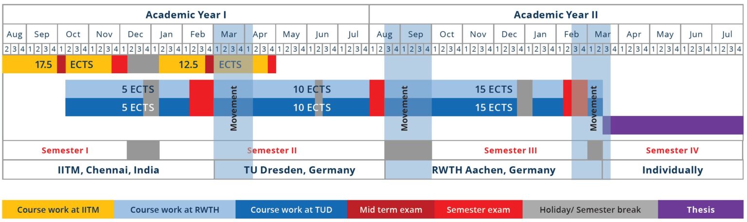 IIT Madras is offering 5 courses (4 Mandatory and 1 Elective), and TU Dresden and RWTH Aachen are offering 6 courses each (3 Mandatory and 3 Elective courses). The Final semester is dedicated to execution of a Master's Thesis with advisors from one or more of the partner and/or associated universities.